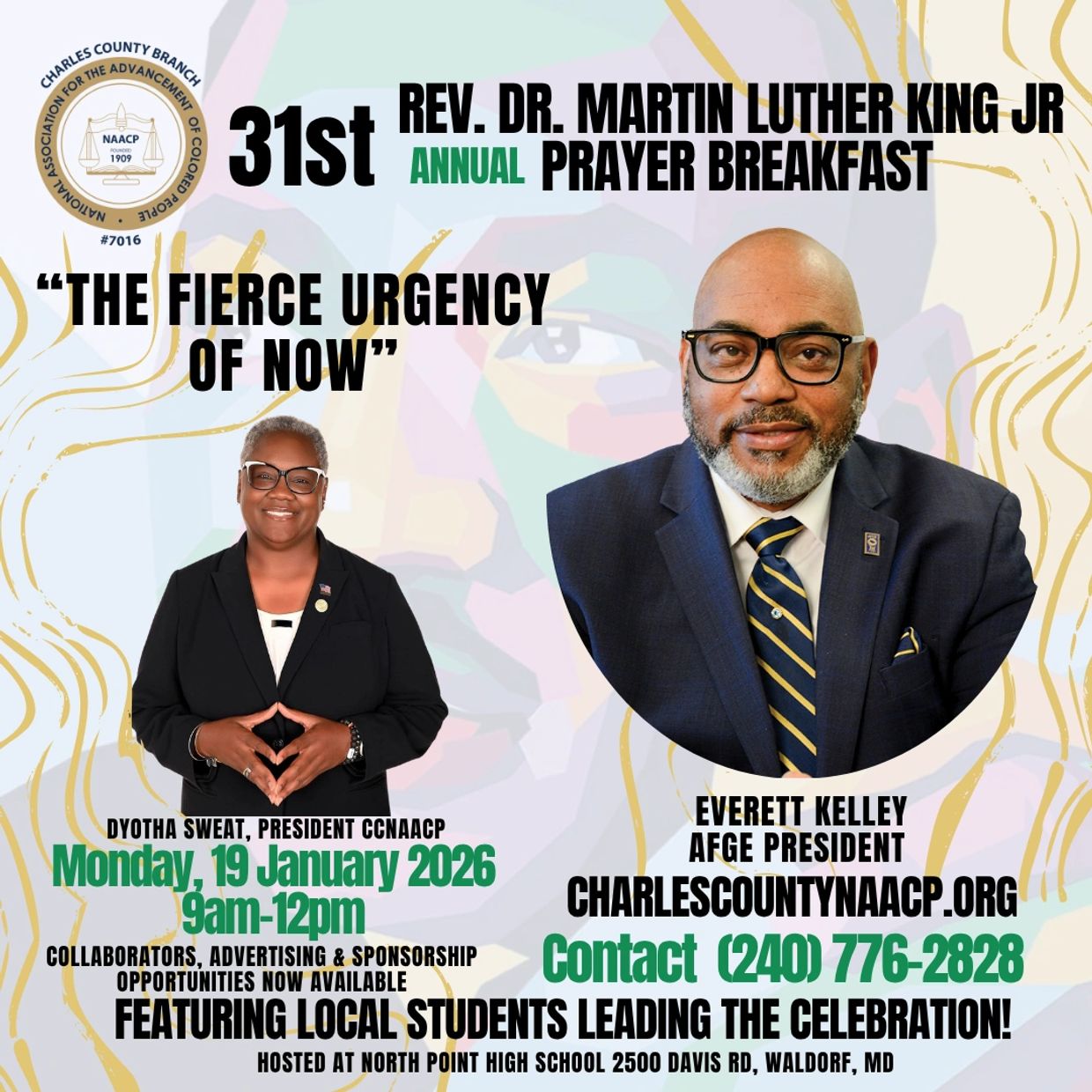 I would like to invite you to attend the 31st Annual Rev. Dr. Martin Luther King, Jr. Prayer Breakfast hosted by the Charles County NAACP with its Sponsors and Collaborators.